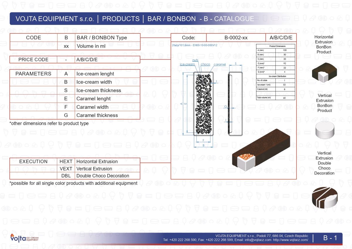 CANDY BAR / BONBON Ice Cream Products can be produced either on horizontal extrusion station mounted on platform of extrusion line (ARCTIC M, ARCTIC CX or ARCTIC DX) or on external worktable (W1 or W2 MACHINE). CANDY BAR / BONBON ice-cream shape is made by extrusion of ice-cream through appropriate nozzles. Products are cut with heated wire or blade and slices are accurately positioned on conveyor trays. Caramel dosing, top decoration, dry ingredients and nearly any shape and flavour combinations are possible. The products on the trays are transported into the hardening tunnel, deeply frozen, picked-up, enrobed with the chocolate (if required) and wrapped to get complete product intended for the market. In our portfolio is possible to find a large range of extrusion nozzles with various shapes. From classic to special shapes consisting of two or more colours.