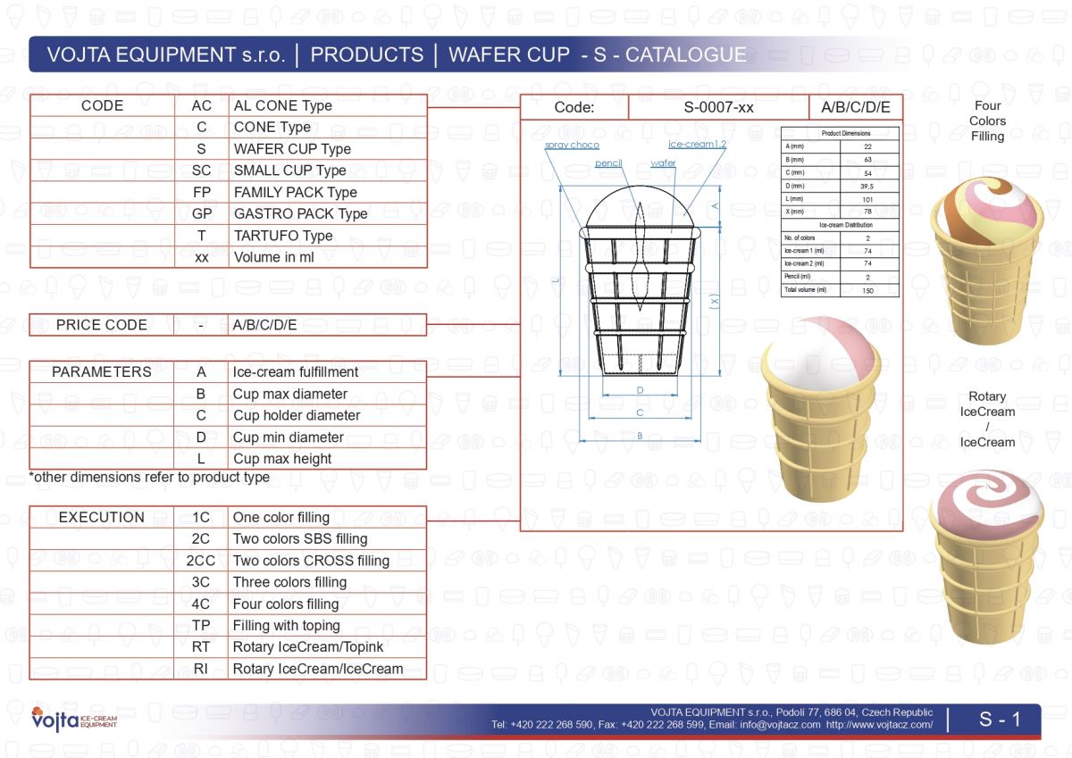 WAFER CUP Ice Cream Products can be produced either on filling station mounted on platform of extrusion line (ARCTIC M, ARCTIC CX or ARCTIC DX), lamella filling machine (LF Series) or any combination thereof. WAFER CUP filled ice-cream shape is made by filling the ice-cream through time elapse filling valves (mounted on platform and fully synchronised to the movements of conveyor trays or installed on lamella filling machine) into pre inserted cones (manually or automatically). Chocolate impregnation, rotation, top decoration, dry ingredients and nearly any shape and flavour combinations are possible. The products on the trays are transported into the hardening tunnel, deeply frozen, picked-up, dipped into the chocolate (if required) and wrapped to get complete product intended for the market. In our portfolio is possible to find a large range of filling types with various shapes. From classic to special rotary shapes consisting of two or more colours.